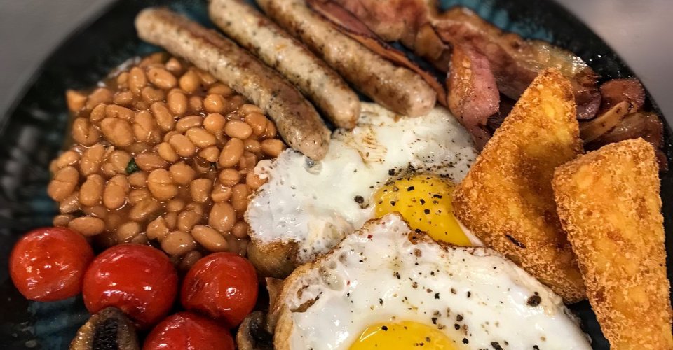 Sázená vejce, anglická slanina, bílé klobásky, fazole v tomatové omáčce, pečená cherry rajčata, bramboráček, opečený toastový chléb 2ks